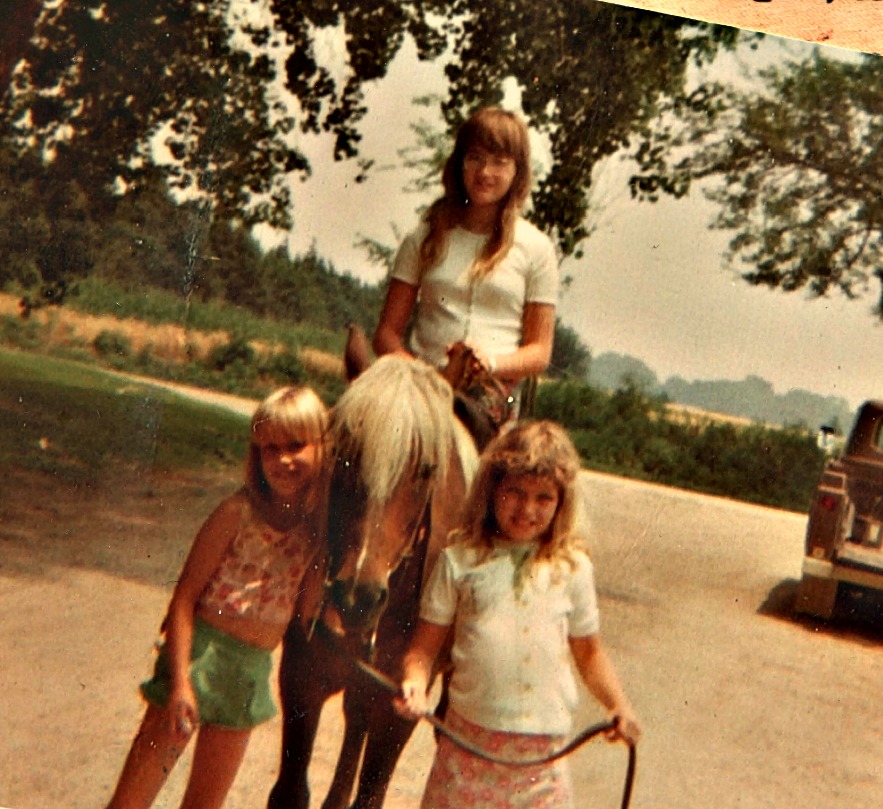 How about another picture? Here's a pony named Chocolate. He belonged to my good friend Darin. At the time, Chocolate seemed huge to me and I had to get a leg-up into the saddle. I remember it seemed to take him (Chocolate, not Darin) a solid six minutes to pee in the yard, and he always did that when Rachel was on him. I do not know why, but I thought it was funny because we were only given ten minutes each to ride! It's a wonder he isn't peeing in this picture. In this photo, Rachel is on him, Andrea is the cutie pie leaning in close to Chocolate's head, and I'm the one with the reins, sticking her stomach out like it's fashionable.